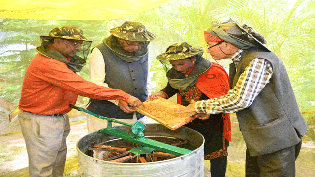 देहरादून: प्रदेश के कृषि एवं कृषक कल्याण मंत्री गणेश जोशी ने अपने शासकीय आवास में शहद उत्पादन के लिए स्थापित किए गए मधुमक्खी के बक्सों से शहद निकाला। उन्होंने जानकारी दी कि 30 बक्सों से लगभग 60 किलोग्राम शहद निकाला गया। उन्होंने इस कार्य के तकनीकी विशेषज्ञों से शहद उत्पादन की प्रक्रिया के बारे में भी जानकारी प्राप्त की।