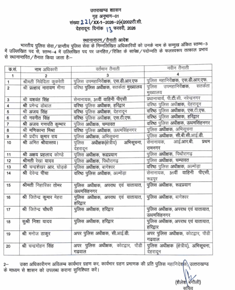 13 फरवरी को उत्तराखंड शासन के गृह अनुभाग-01 द्वारा जारी आदेश के तहत राज्य पुलिस सेवा और भारतीय पुलिस सेवा के कुल 20 अधिकारियों के तबादले और नई तैनातियां की गई हैं। यह आदेश तत्काल प्रभाव से लागू कर दिया गया है। शासन ने अधिकारियों को शीघ्र कार्यभार ग्रहण कर इसकी सूचना पुलिस मुख्यालय के माध्यम से उपलब्ध कराने के निर्देश दिए हैं। जारी सूची के अनुसार एसडीआरएफ में तैनात पुलिस उपमहानिरीक्षक श्रीमती निवेदिता कुकरेती को पुलिस महानिरीक्षक, एसडीआरएफ के पद पर तैनाती दी गई है। वहीं वरिष्ठ पुलिस अधीक्षक सतर्कता मुख्यालय श्री प्रहलाद नारायण मीणा को पुलिस उपमहानिरीक्षक, सतर्कता मुख्यालय बनाया गया है।